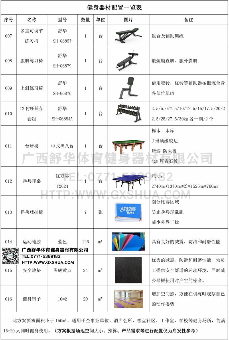 此方案要求面积小于150m²,适用于企事业单位、酒店会所、楼盘社区、工作室、学校等健身场所,能满15-20人同时健身使用。(方案根据场地空间大小、预算、产品需求等进行配置仅为启发性参考)
